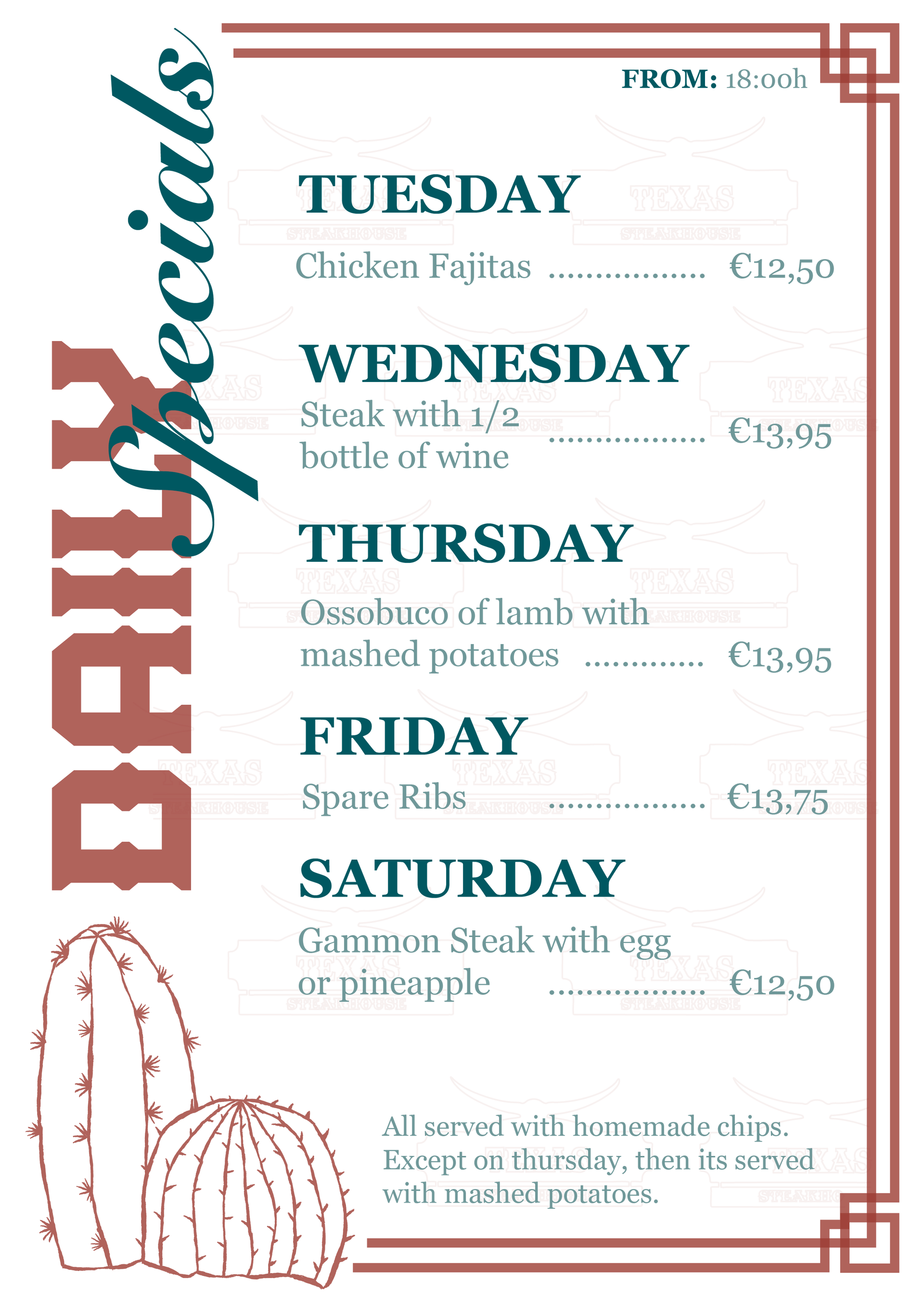 All our main courses are served with chips or jacket potato with sour cream (+€ 1,50) and coleslaw.