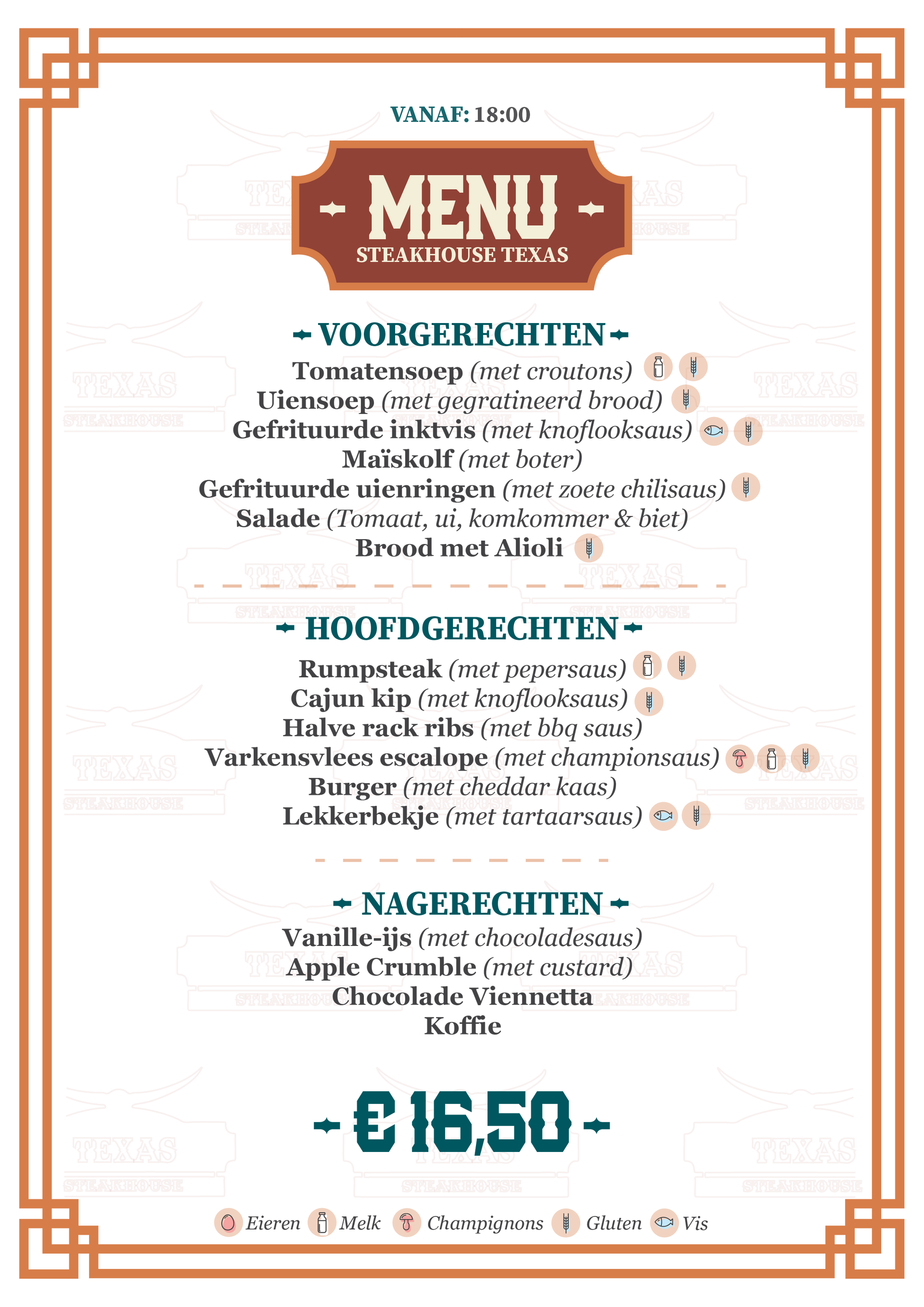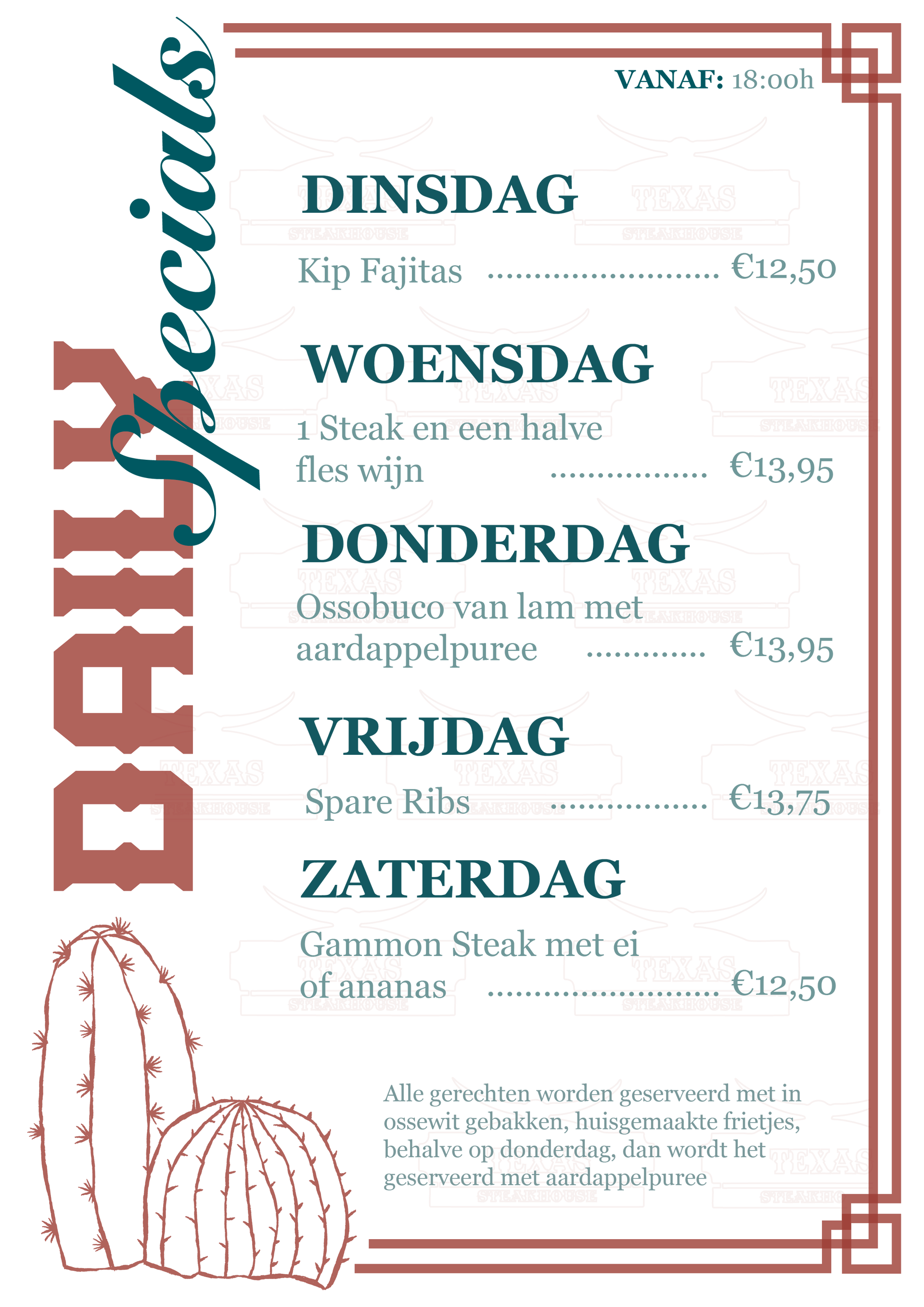 Alle hoofdgerechten worden geserveerd met friet, of gepofte aardappel met zure room (+€ 1,50) en koolsla.